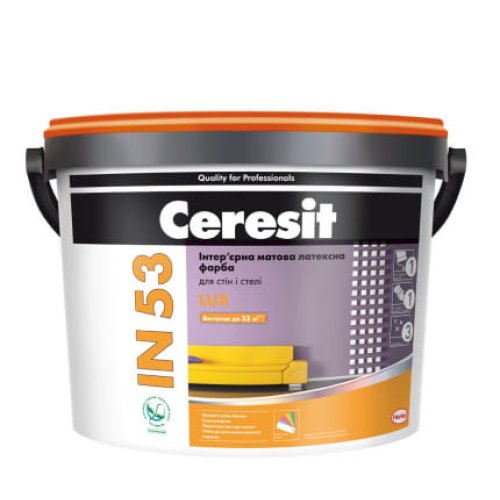 Акриловая белая краска Ceresit IN 53 предназначена для окрашивания поверхностей строительных конструкций и элементов внутри зданий по минеральным (бетон, кирпич, цементно-песчаные штукатурки, гипсовые штукатурки и плиты) и органическим основаниям (обои, стеклохолст, пенополистирольные плиты, фанера, древесностружечные и древесноволокнистые плиты) в помещениях с нормальной эксплуатационной нагрузкой. Возможно многократное ремонтное перекрашивание без удаления предыдущего слоя. Не применять для окраски полов. Разрешена к использованию в зданиях медицинского назначения и детских учреждениях.