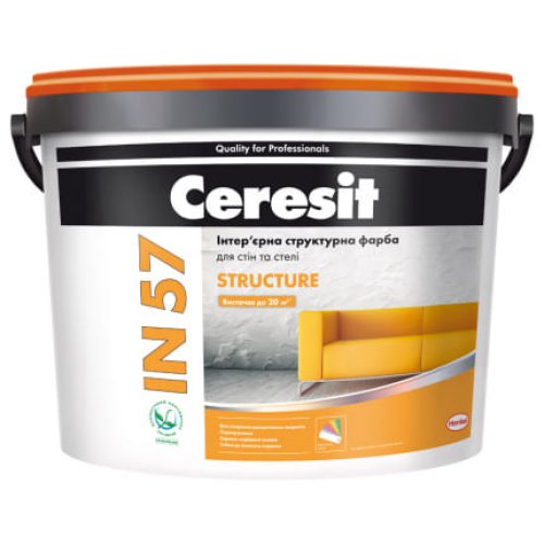 Структурна акрилова фарба Ceresit IN 57 призначена для обробки поверхонь стін і стель усередині будівель. Фарба наноситься як по мінеральних (зокрема, гіпсові штукатурки і плити тощо), так і по органічних основах (шпалери, склохолст, пінополістирольні плити, фанера, деревостружкові та деревоволокнисті плити). Застосовується також по раніше пофарбованих поверхнях. Дозволена до використання в будівлях медичного призначення та дитячих закладах
