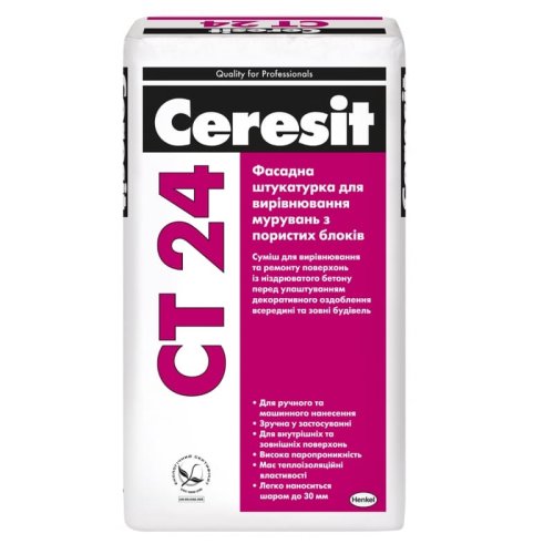 Суміш Ceresit СТ 24 призначена для вирівнювання поверхонь із ніздрюватого бетону (газо- та пінобетону, ракушняку, керамзитобетону тощо) перед оздобленням всередині та зовні будівель. Ефективна для заповнення швів, ремонту тріщин, раковин та інших дефектів. Рекомендується для вирівнювання цегляного мурування, цементно-піщаних блоків, поверхонь з бетону тощо. Товщина шару за одне нанесення — від 3 до 30 мм.